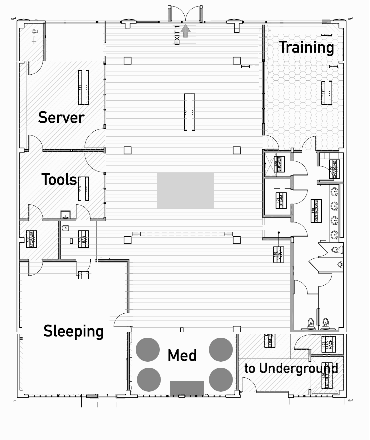 The base is a large converted warehouse in the LA warehouse district. Characters begin in the sleeping area. The tools room has all of the tools they bought with their point buys. The training room contains some mats, weights, and punching bags. They enter the underground through a large elevator.
